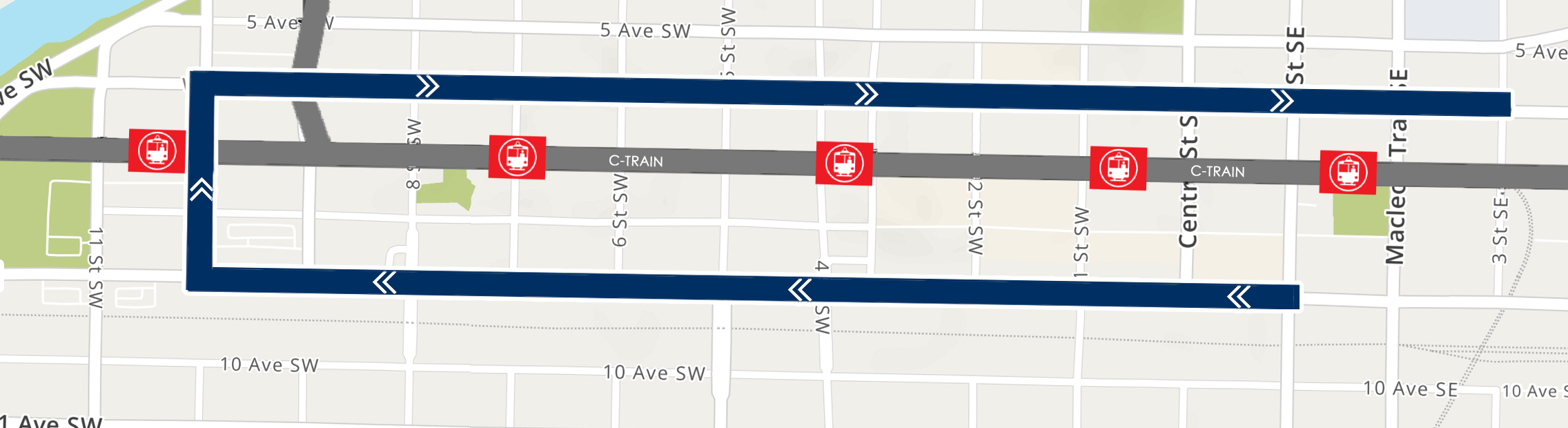 Parade begins on 9 Avenue at 1 Street SE and runs west to 10 Street SW, then turns north to 6 Avenue and travels eastbound until 3 Street SE
